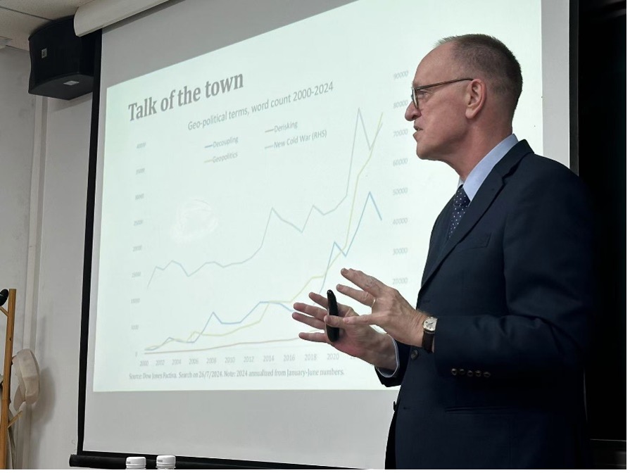 与国际交流与合作处联合举办学术讲座,邀请新加坡国立大学东亚研究所教授、前所长Bert Hofman作为主讲嘉宾,以“地缘政治紧张局势和不断变化的供应链”为题发表演讲,讲座由中国社会科学院大学校长助理展龙教授主持。