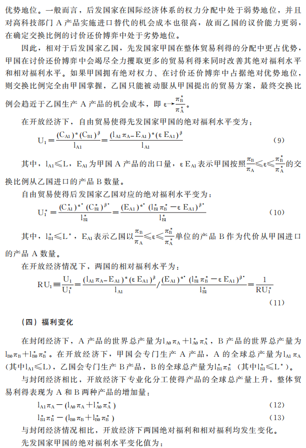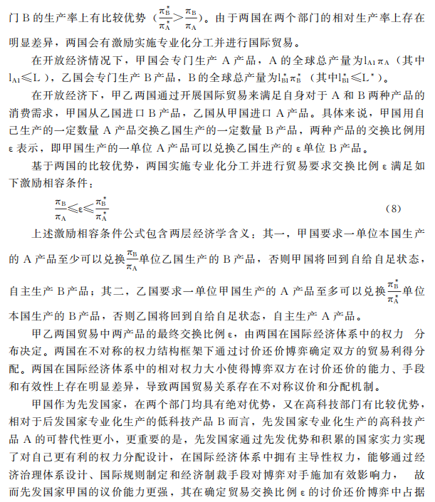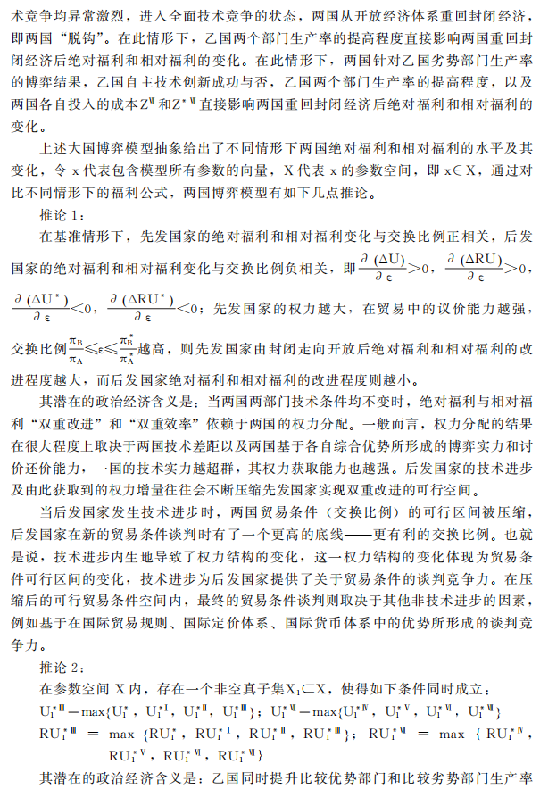 第一,绝对福利与相对福利“双重改进”和“双重效率”依赖于两国的技术分布和权力分配, 后发国家的技术进步和权力获取往往会导致贸易条件(交换比例)的可行区间被压缩,后发国家在贸易条件谈判时有了一个更高的底线——更有利的交换比例,先发国家实现双重改进的可行空间受到限制。