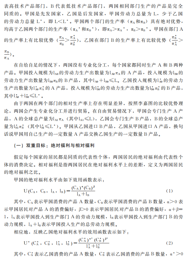 经典国际贸易理论主要从绝对福利改进的维度探讨自由贸易的结果,有意或无意地忽视了对相对福利变化的关注。所谓绝对福利,即行为体从财富或消费中所获得的满足感或效用。所谓相对福利,即行为体从与其他行为体的福利比较中所获得的满足感或效用。大卫·李嘉图(David Riardo)的“比较优势理论”是西方经典贸易理论的重要基石之一,其核心思想是两个国家在两种产品上的技术水平、劳动生产率和生产成本存在差异,即使一国在两种产品上均处于绝对劣势,两国依然可以通过专业化生产具有比较优势(绝对优势更大或绝对劣势更小)的产品并进行自由贸易来实现双方的福利改进。比较优势理论为基于技术差异和生产率异质性的国际贸易理论奠定了思想基础,相关的后续研究不仅将李嘉图两国两部门研究框架拓展为两国多部门和多国多部门框架还将部门层面的比较优势拓展至企业层面的比较优势。然而,这些研究的规范分析高度集中于绝对福利,很少触及相对福利,以致由英国古典政治经济学家提出的自由贸易理论在过去200多年里一直得到大多数经济学家的认同,因为仅从绝对福利的角度看,自由贸易能让所有参与其中的国家或地区获得福利改进。不过,这一共识在21世纪初开始发生变化,面对世界百年未有之大变局下“经济实力消涨、科技竞争加剧”“权力政治回归、规则博弈白热化”等新特征,部分西方主流经济学家对自由贸易的理解发生了本质性变化。