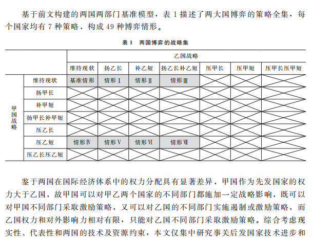 摘要:传统国际贸易理论对于国家间博弈过程中保持、扩大自身相对实力的权力追求缺乏考量。而在大国博弈背景下,权力在先发国家与后发国家间贸易中的重要性则更加凸显。基于此,在经典的两国贸易理论中引入权力要素,将经济学注重的绝对福利和政治学注重的相对福利视作行为体的双重目标,运用博弈论方法,可以为大国博弈建立一个简洁、方便、贴近现实、适用广泛的国际经济政治学分析框架。由此可以发现,在一个由先发国家和后发国家组成的两国博弈中,后发国家更加偏好“扬己长补己短”战略;先发国家更加偏好于“压彼短扬彼长”战略,而一旦决定比较优势的技术差距由大变小,先发国家则更倾向于全面打压后发国家甚至“脱钩”。