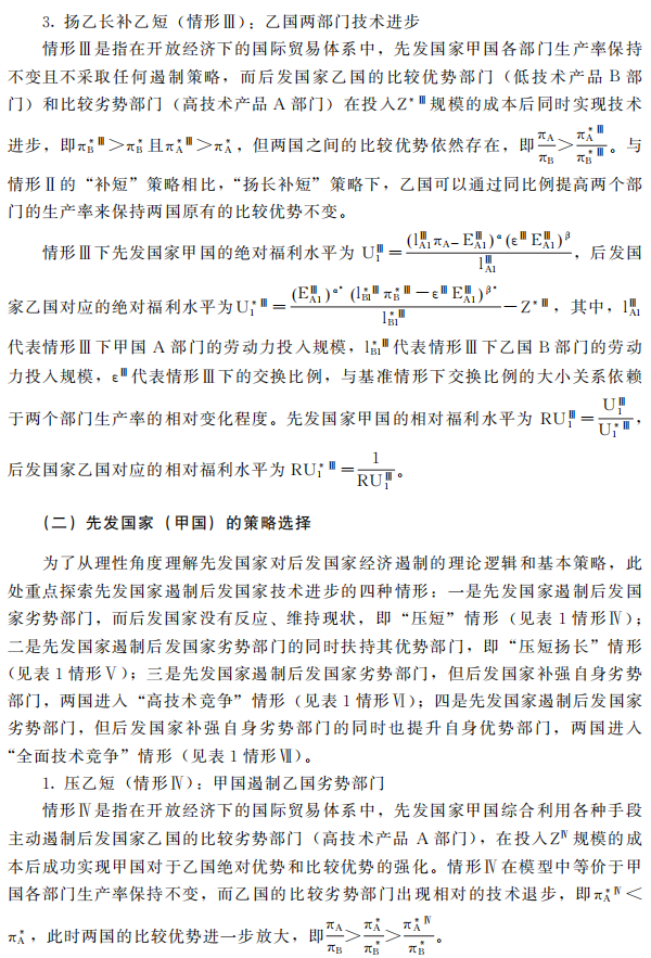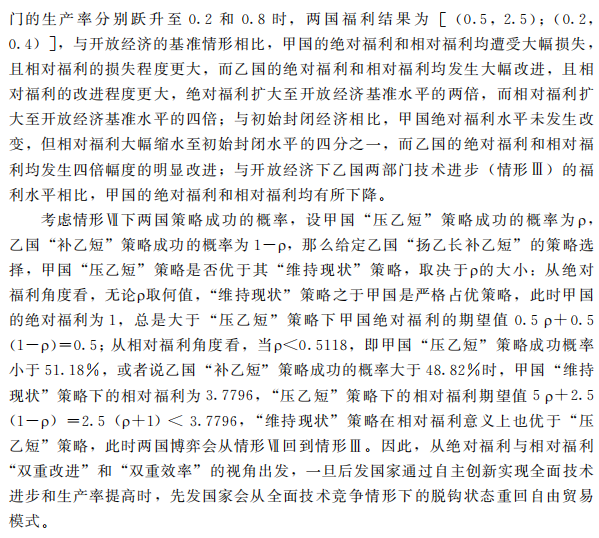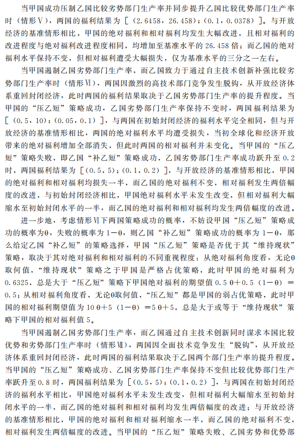 第五,在绝对福利与相对福利“双重改进”和“双重效率”的分析视角下,一旦后发国家通过自主创新实现全面技术进步和各部门生产率提高,先发国家会寻求从全面技术竞争下的“脱钩”状态重新回到开放经济下的“互联互通”模式。