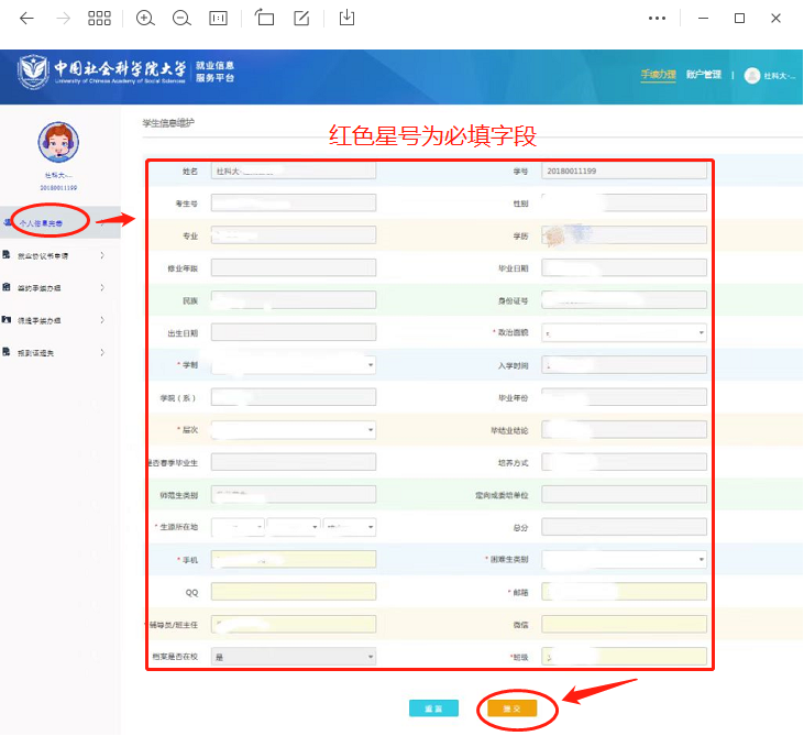 如果不是初次登录,在左侧功能模块选择“个人信息完善”,然后填写右侧方框内的个人信息。有红色星号标记的是必填字段
