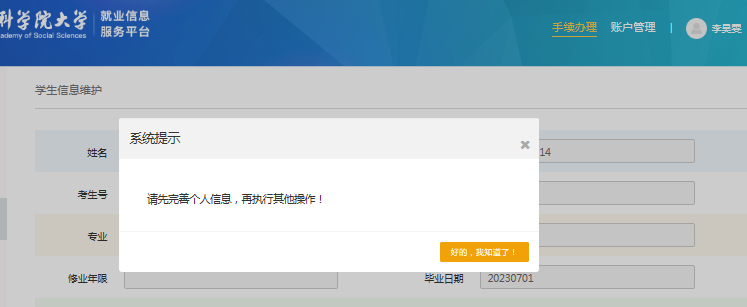 第二步:初次登录需要首先完善个人信息,根据系统弹窗提示填写个人有关信息即可。