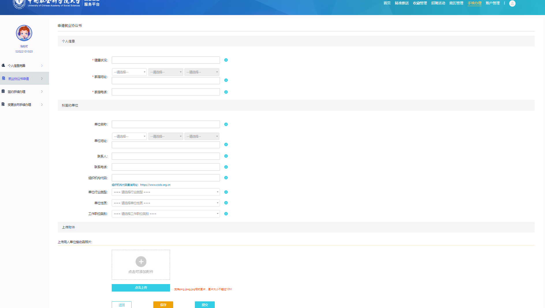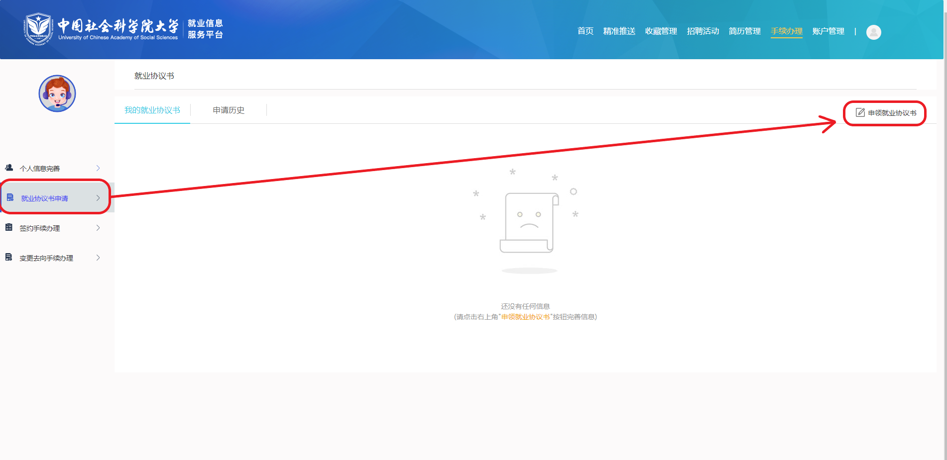 第三步:在左侧功能模块选择“就业协议书申请”,然后点击右上角“申请就业协议书”。
