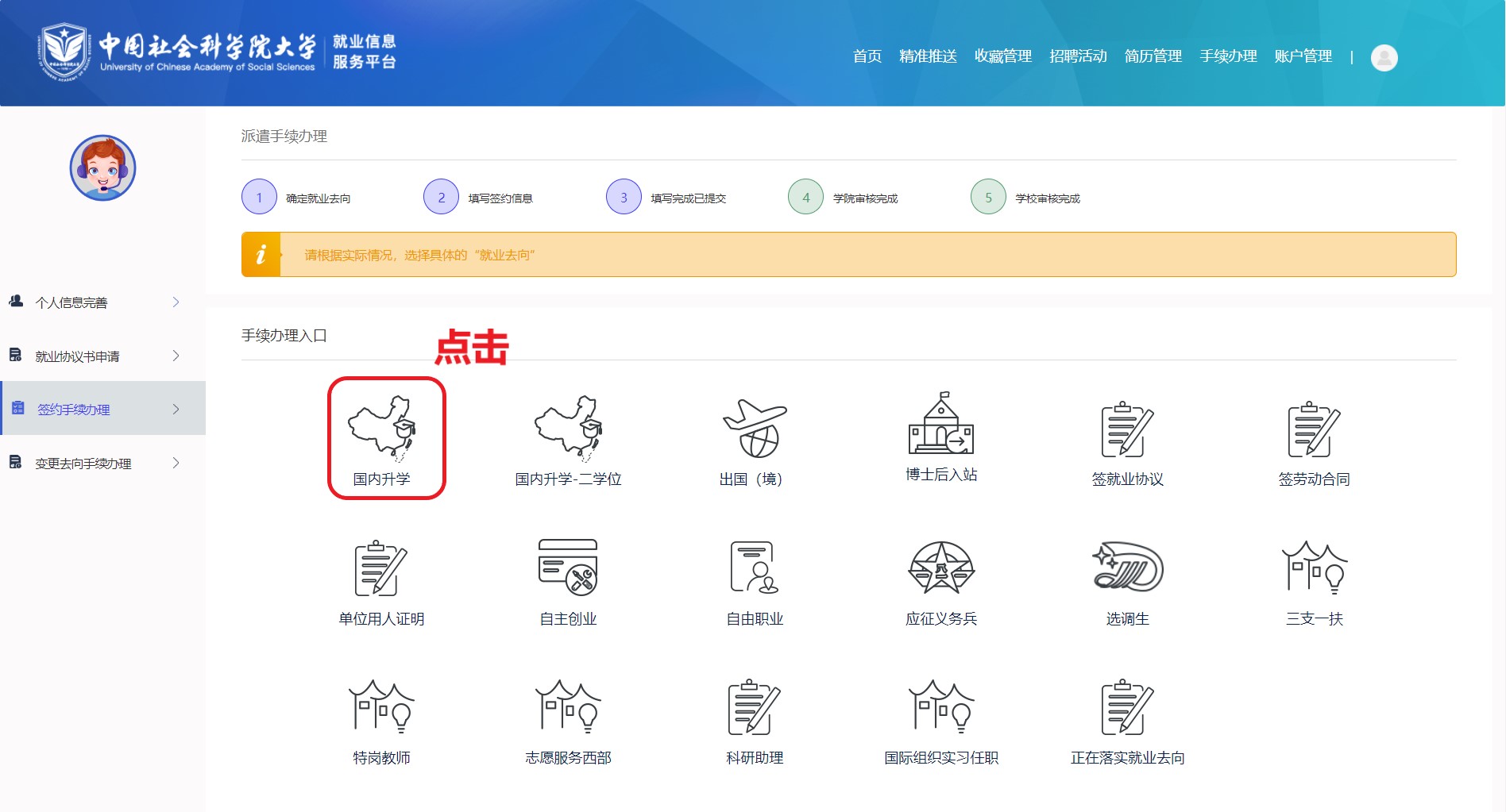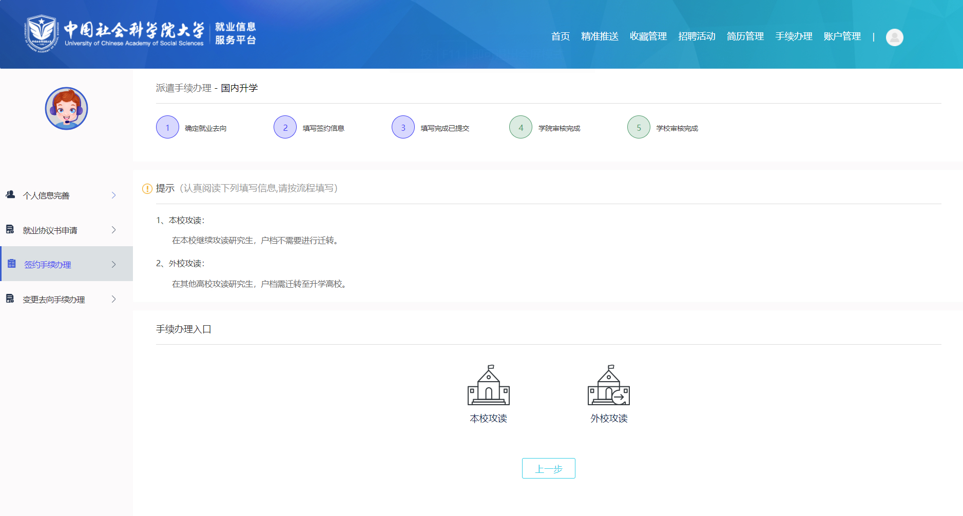 第三步:完善个人信息后,点击“个人信息完善”下方的“签约手续办理”,点击“填写签约信息”,选择“国内升学”—— “本校攻读”/“外校攻读”,进入相应填写界面,根据自己升学的实际情况填写相关信息,并按照提示上传相应的证明材料。确认无误后提交等待审核。