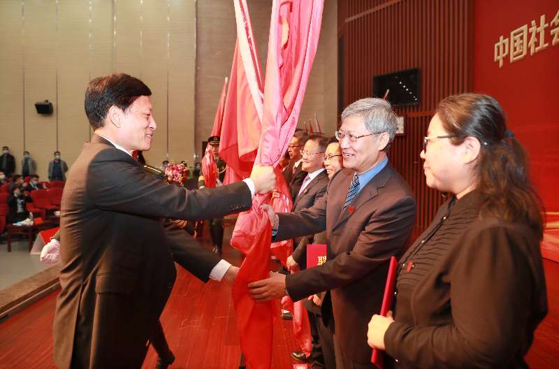 (中国社会科学院院长、党组书记谢伏瞻向张宇燕院长授旗帜)