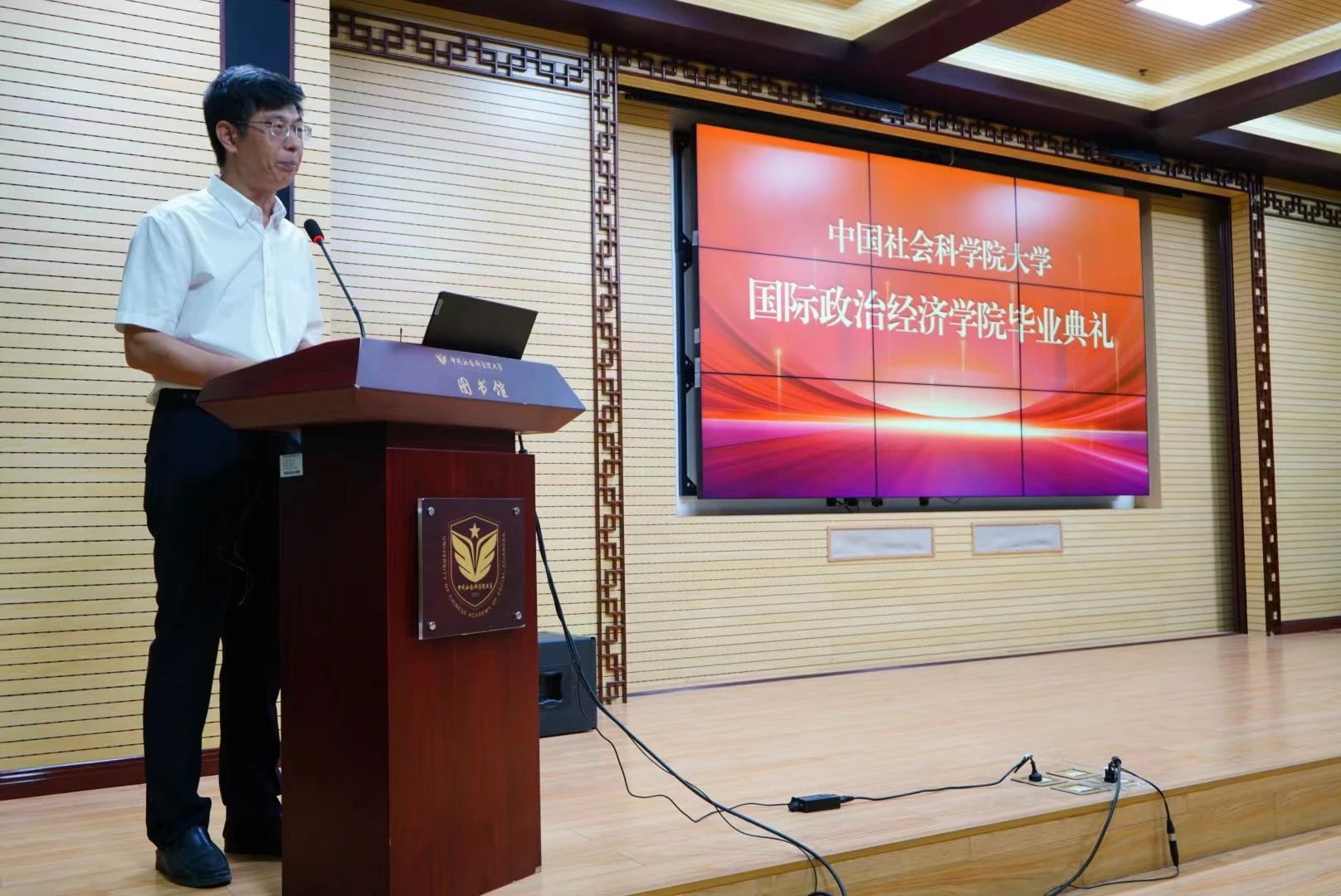 院长张宇燕教授在典礼上发表致辞,强调专业学习中兴趣的重要性,并鼓励毕业生们要继续学习,勇于创新,热爱祖国、为人类发展做出贡献。